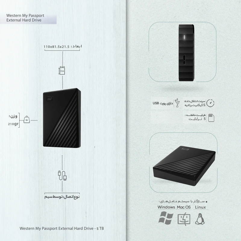 هارددیسک «My Passport» محصولی از شرکت «وسترن دیجیتال» یا همان WD است که در گروه هارددیسکهای اکسترنال قابل حمل قرار میگیرد. این هارددیسک از طریق رابط USB3.0 به رایانه متصل میشود و میتواند اطلاعات را با سرعت زیاد انتقال دهد. سایز هد ارایه شده روی این محصول 2.5 اینچ بوده که سایز استاندارد برای هاردهای اکسترنال محسوب میشود. طراحی این هارد بهگونهای است که هنگام در دست گرفتنش سادگی منحصر به فرد آن هر سلیقهای را راضی میکند. ظرفیت 5 ترابایتی این هارددیسک برای افرادی که اطلاعات زیادی برای ذخیرهسازی دارند، مناسب است. ابعاد بسیار کوچک و وزن مناسب My Passport باعث شده که به راحتی بتوان همیشه آنرا با خود همراه داشت. اگر قصد تهیهی یک هارددیسک ساده را دارید، My Passport میتواند انتخاب مناسبی برای شما باشد. یکی از ویژگیهای این مدل رنگبندی آن است. شما میتوانید این محصول را در 3 رنگ مشکی، قرمز و آبی تهیه کنید. برای افرادی که هاردهای زیادی دارند، استفاده از رنگ بندی برای تفکیک هارد کارایی دارد.